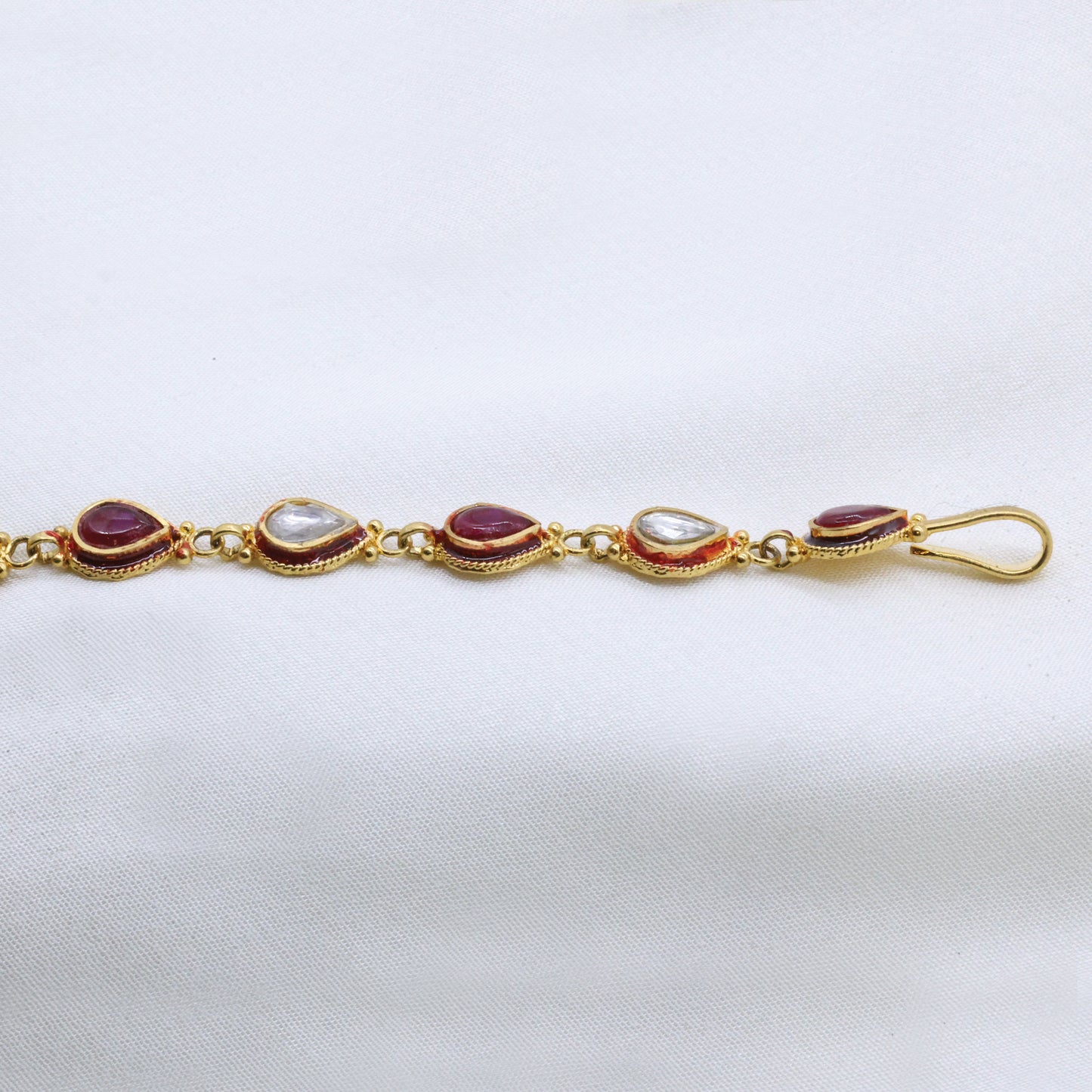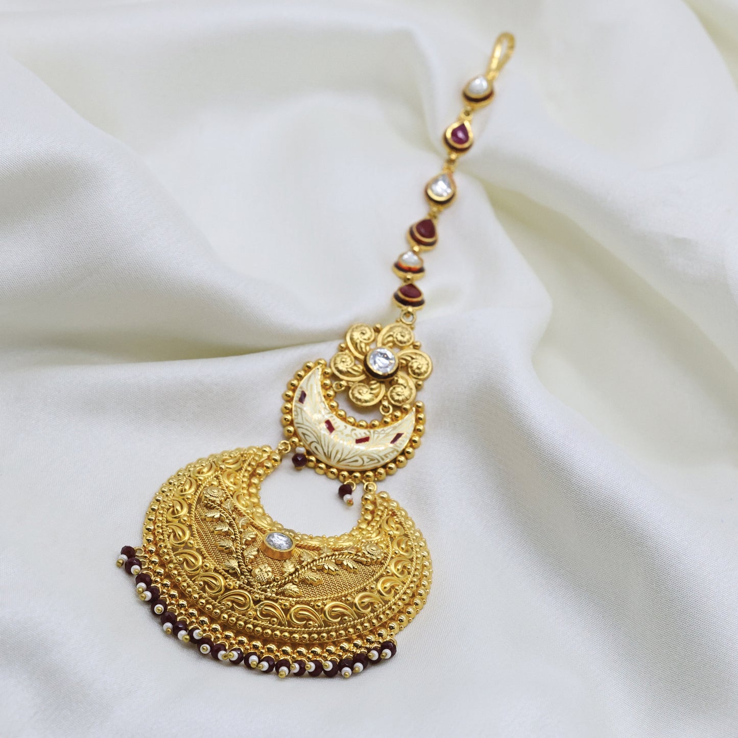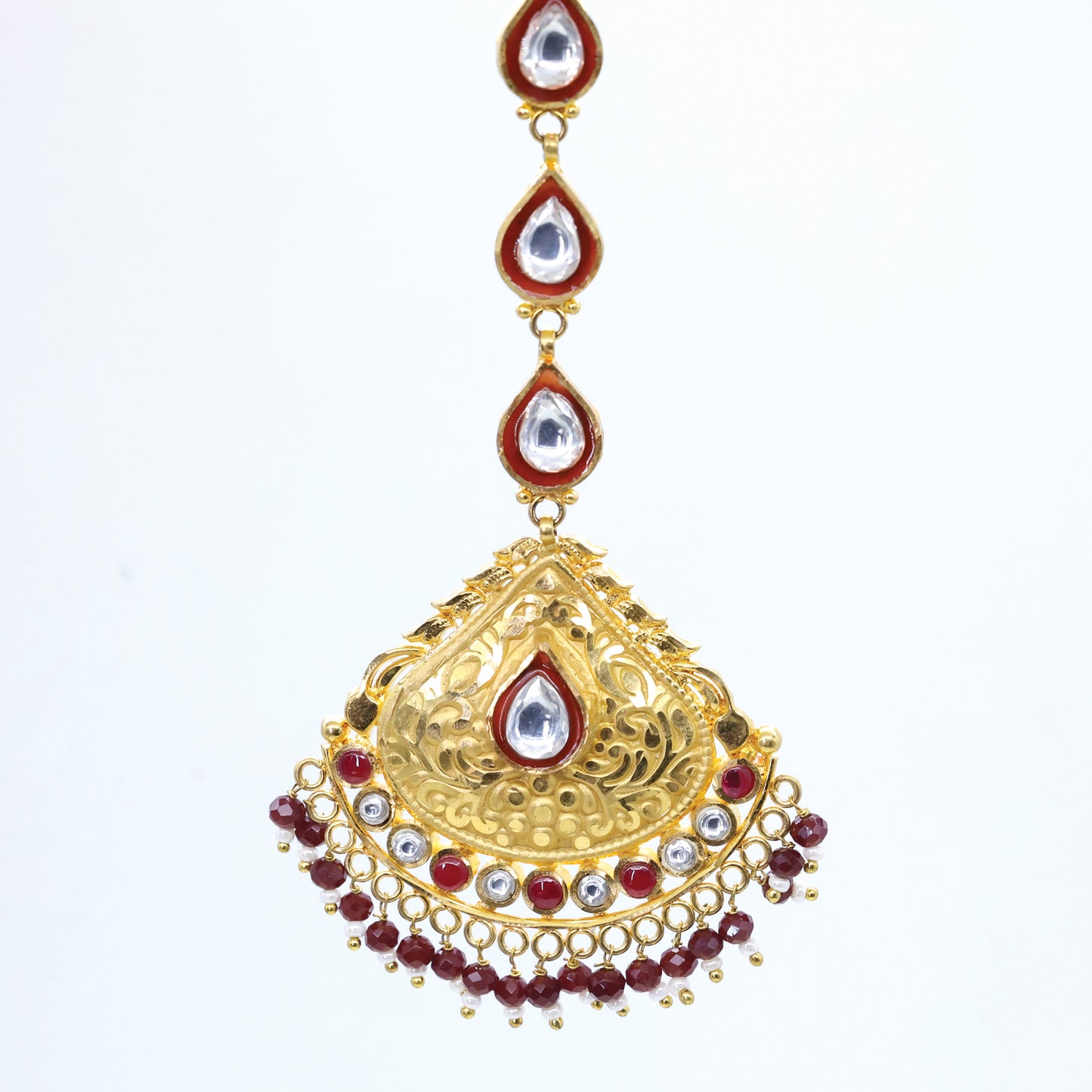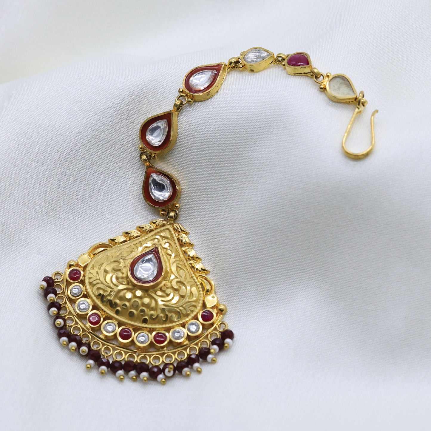 Add 24Kt Gold Plated Bridal Look Chandrika Maang Tikka With Silver-Maroon Kundan Work to the cart