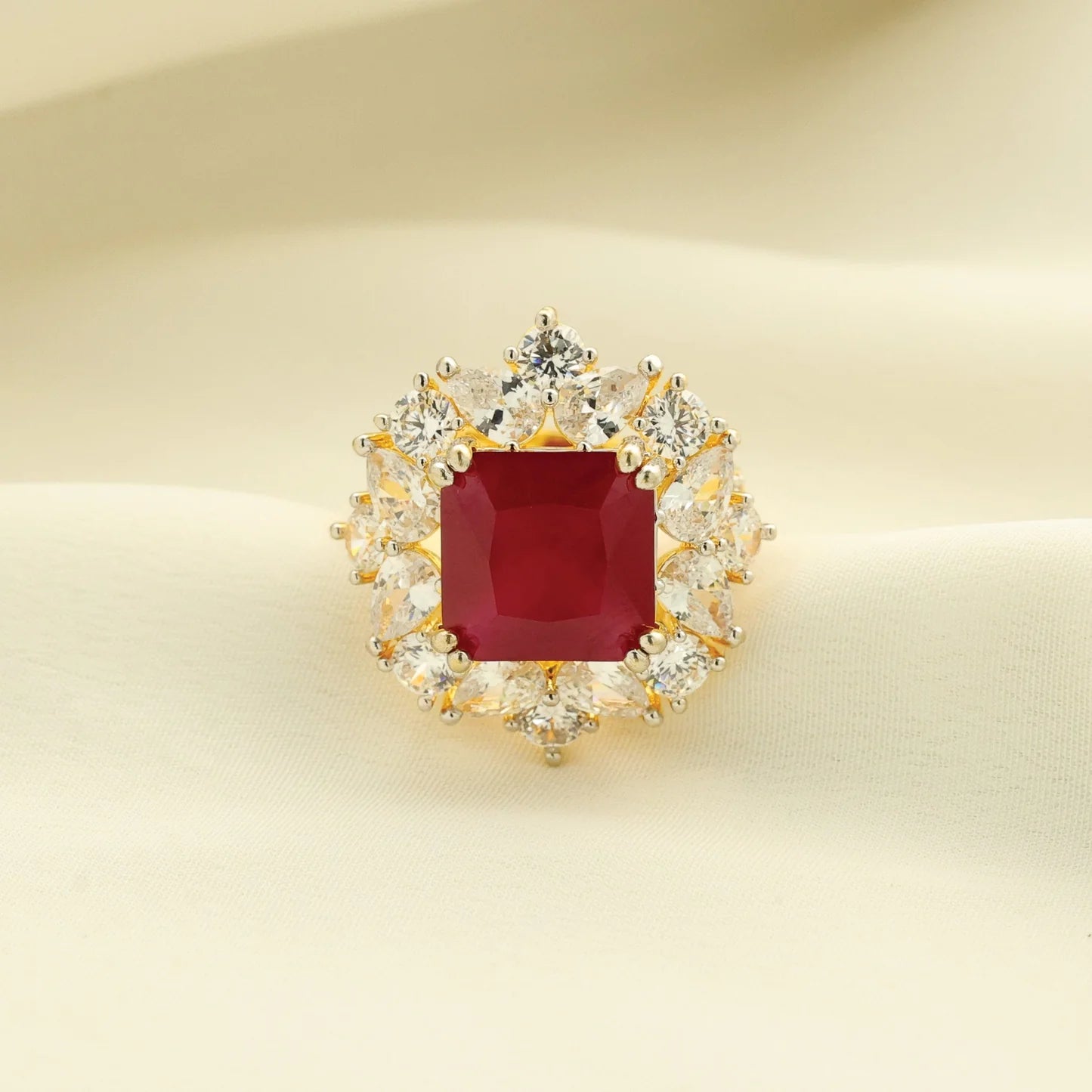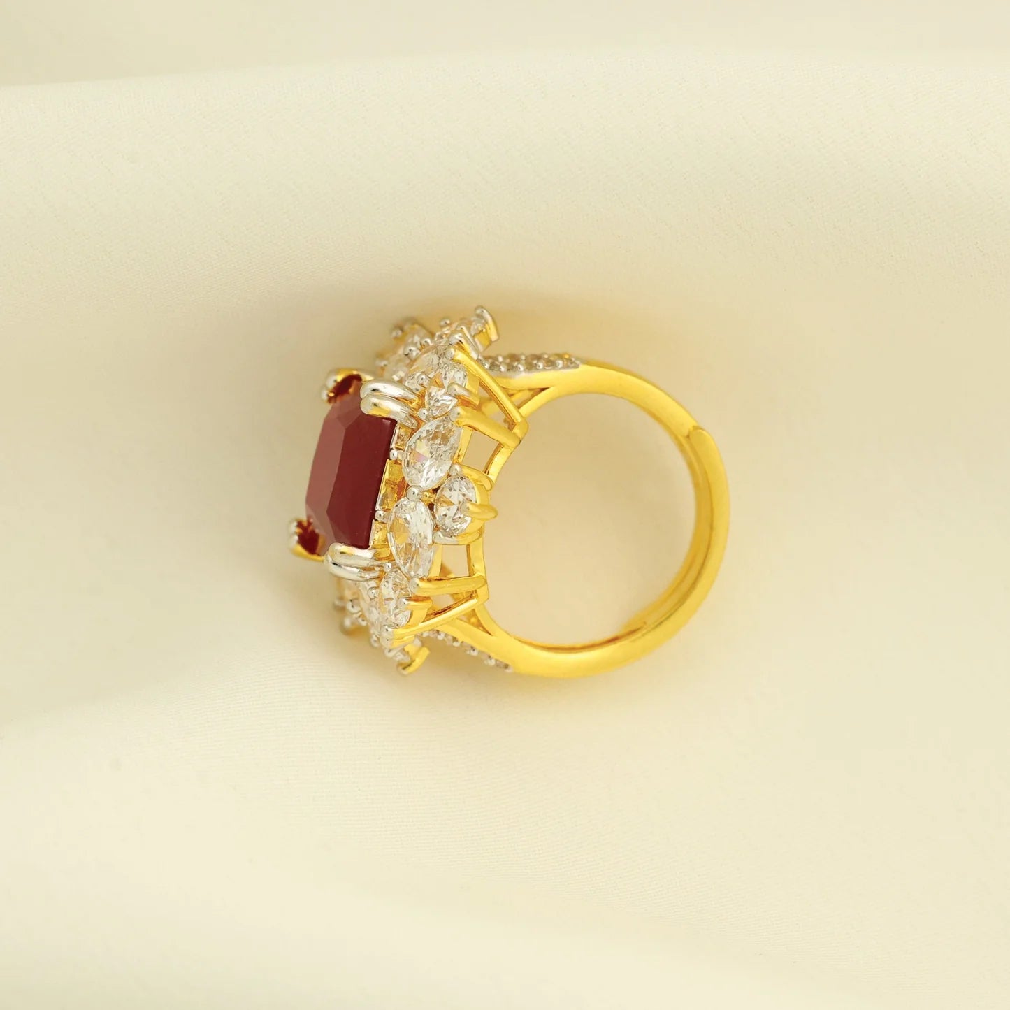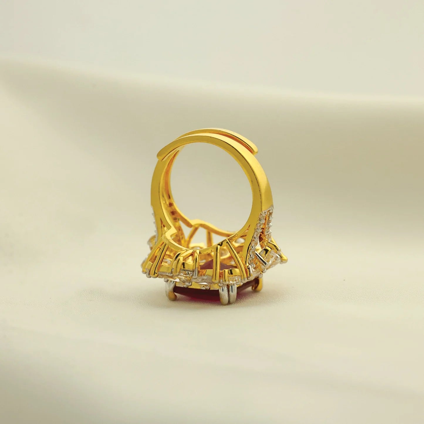 24kt Gold Plated Fashionable Ruby Cut Stone With American Diamond Ladies Ring