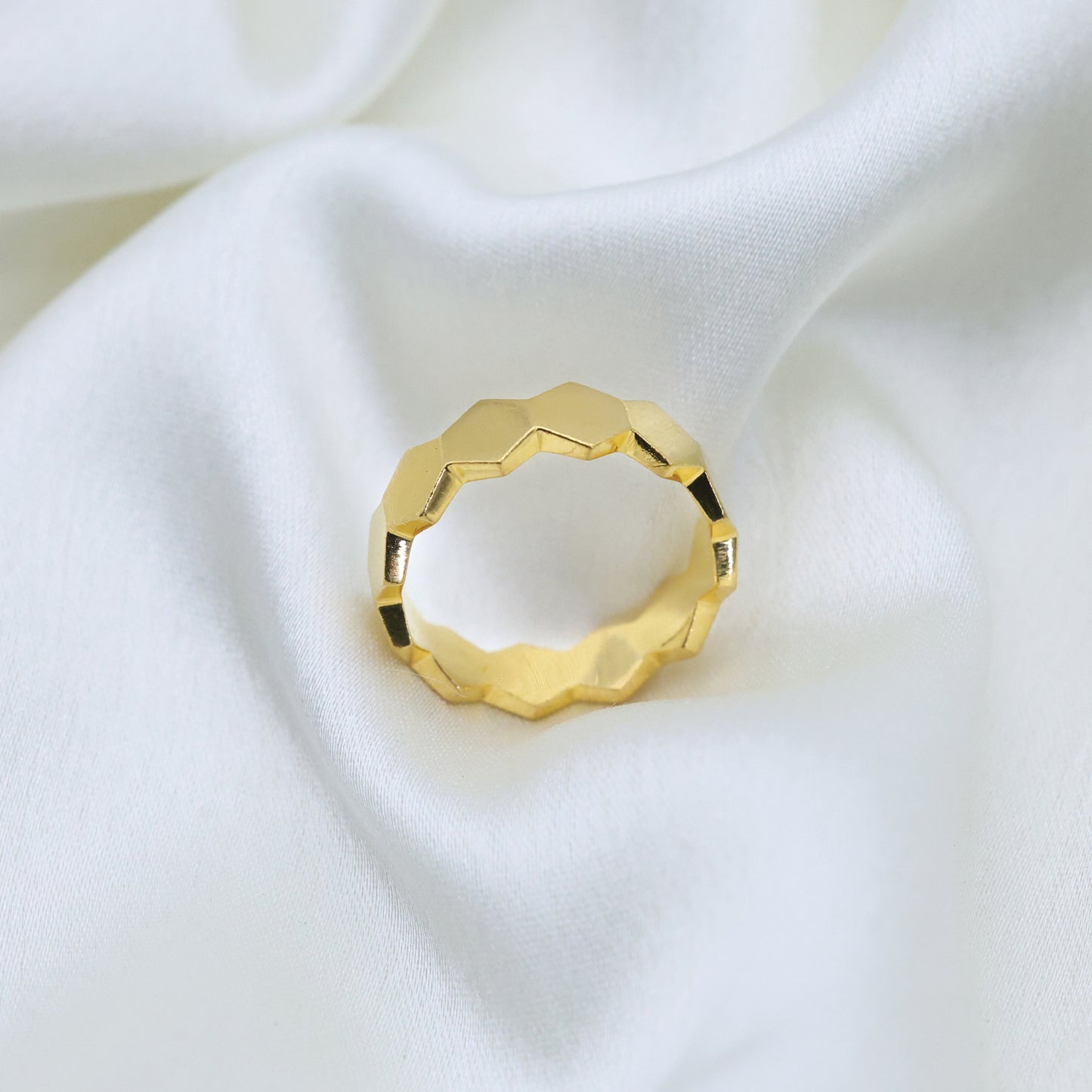 Regular price Rs. 3,710.00The ring features a distinctive and robust design, characterized by a continuous band of interconnected hexagonal or geometric segments, creating a textured and visually engaging surface. The polished gold-plated finish replicates the rich luster of solid gold, making it a striking accessory. Its substantial form factor makes it suitable for a "gents' ring," offering a masculine and bold statement piece.