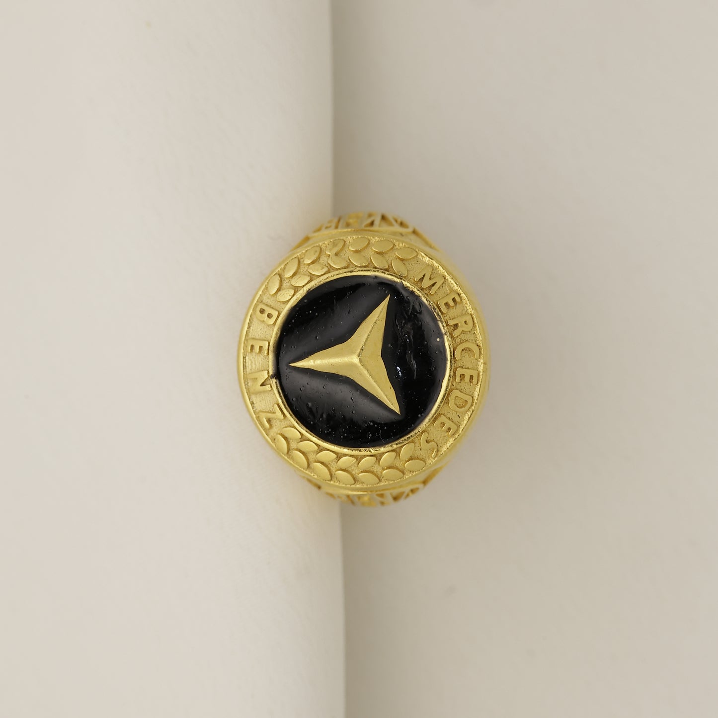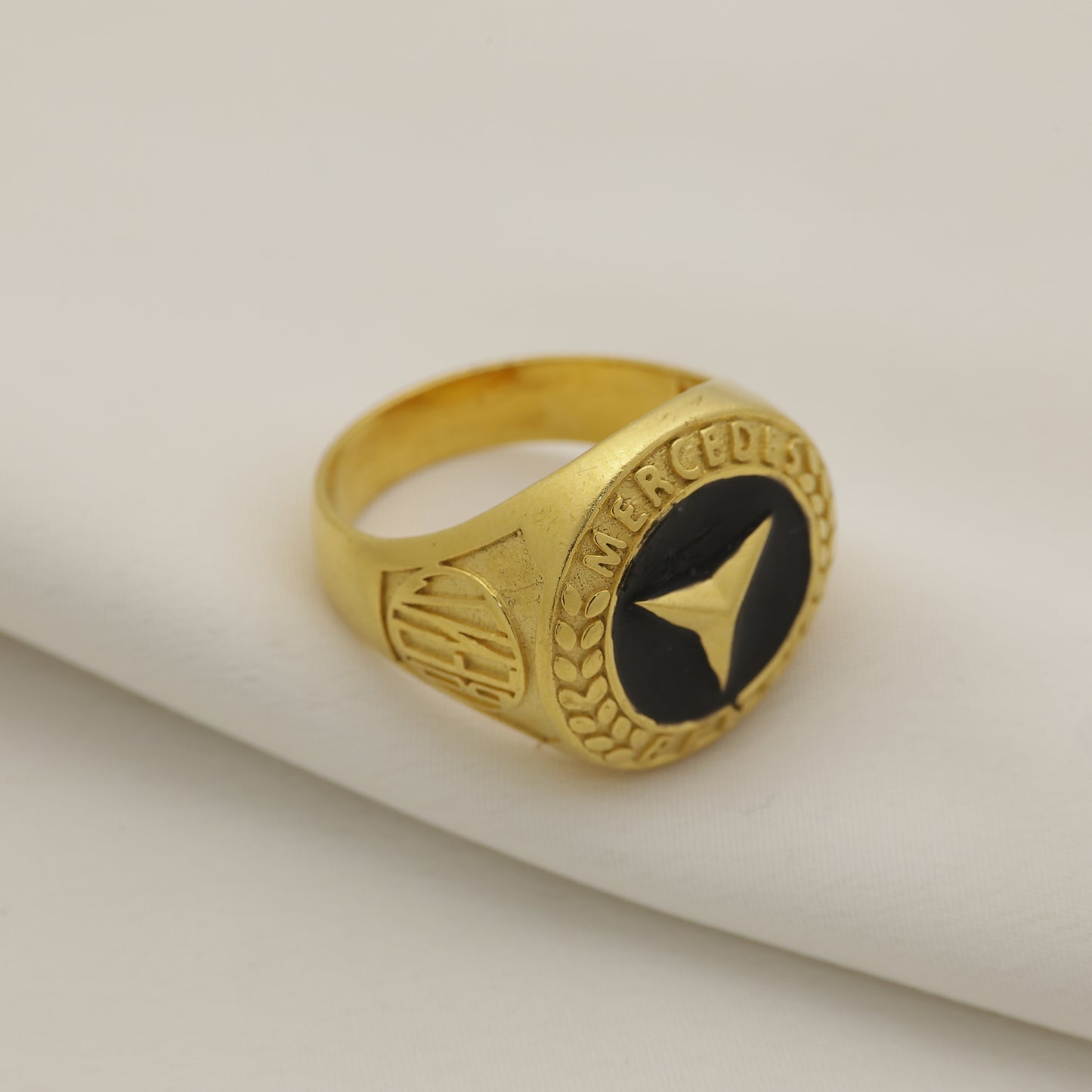 Add 24Kt Gold Plated Mercedes Logo Black Stone Designer Gents Ring for Men | Luxury Statement Ring to the cart