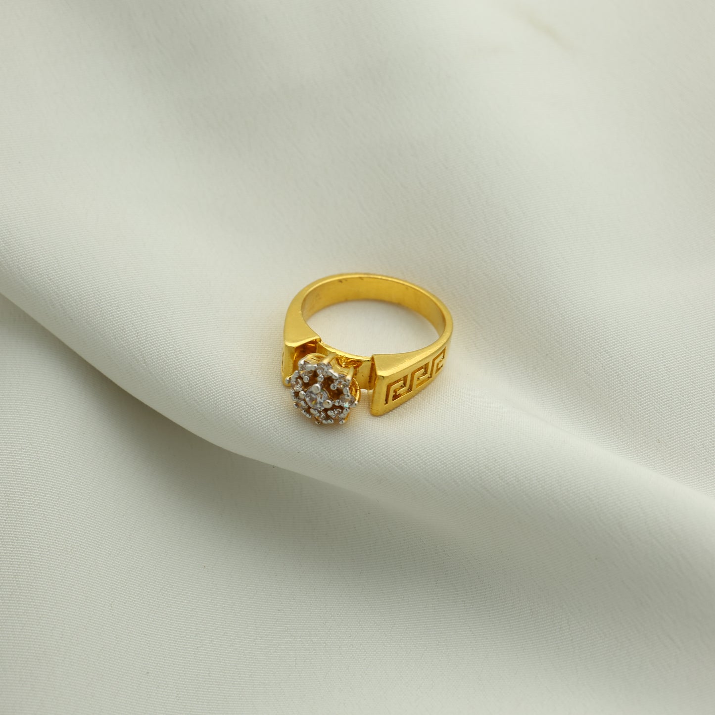 Add 24Kt Gold Plated American Diamond Round Cluster Gents Ring – Greek Pattern Design to the cart