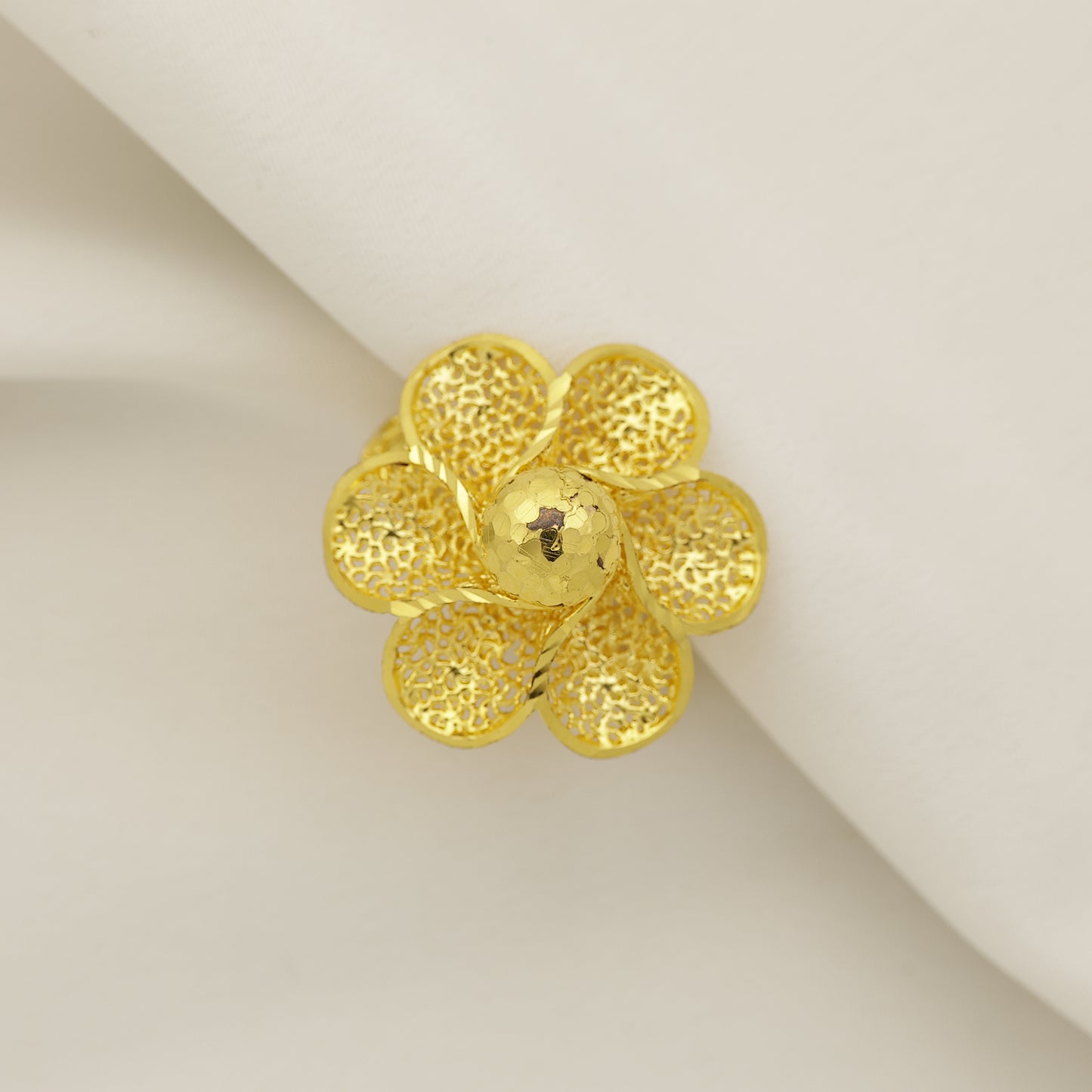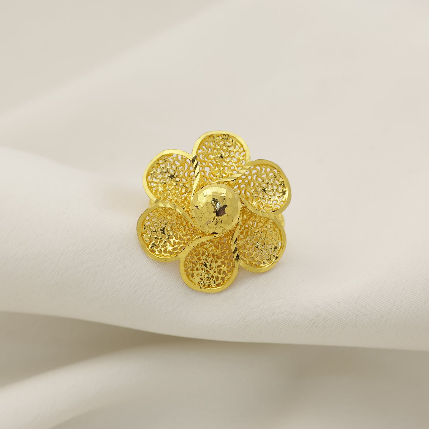 Add a graceful charm to your jewellery collection with this beautifully designed 24Kt Gold Plated Floral Cutwork Designer Statement Ring. Crafted in an elegant floral pattern, the ring features intricate cutwork detailing on each petal along with a textured center that enhances its rich and eye-catching appeal.